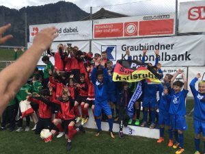 Das Wichtigste am Anfang: Ein großes und fettes Merci an den FC Landquart-Herrschaft. Es war ein perfekt organisiertes Turnier. Aber es war mehr: Es war eure außergewöhnliche Gastfreundschaft. Und es fing schon während der Anreise an. Eigentlich wollten wir von Karlsruhe nach Landquart per ICE fahren. Aber die Deutsche Bahn schaffte es nicht den Zug pünktlich einzusetzen. Deshalb endete der Zug statt in Chur in Basel SBB. Als wir noch nach alternativen Verbindungen suchten, kam von Jan aus Landquart schon per WhatsApp die Alternativ-Verbindung. Wie geil ist das denn? Dann in Landquart angekommen, stand Jan schon mit seinem Wagen bereit und hat unser Gepäck eingesammelt, damit wir gemütlich zum Sportplatz des FC Landquart-Herrschaft spazieren. Dort angekommen war der Grill schon auf Betriebstemperatur. Wir brauchten nur noch im Clubhaus Platz nehmen, und schon servierte uns das Team des FC Landquart-Herrschaft unser Nachtessen – Burger und Pommes. Danke, dass wir am 41. Auffahrtsturnier teilnehmen durften! Danke, für eure großartige Gastfreundschaft und Unterstützung! Wir sind mit Vorfreude in Karlsruhe abgereist und mit überwältigenden Eindrücken wieder zurückgekommen!
