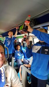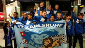 Die Zugfahrt nutzten unsere Feierbiester, um ihren erfolgreichen Tag zu feiern. Gegen 22:00 erreichten unsere Löwen müde, aber vor allem stolz und glücklich den Bahnhof in Karlsruhe. Hier wurden unsere Jungs gebührend von den Eltern mit Fahnen und Trompeten am Bahnhof empfangen. Die Bahnhofspolizei war irritiert, hielt sich aber im Hintergrund.