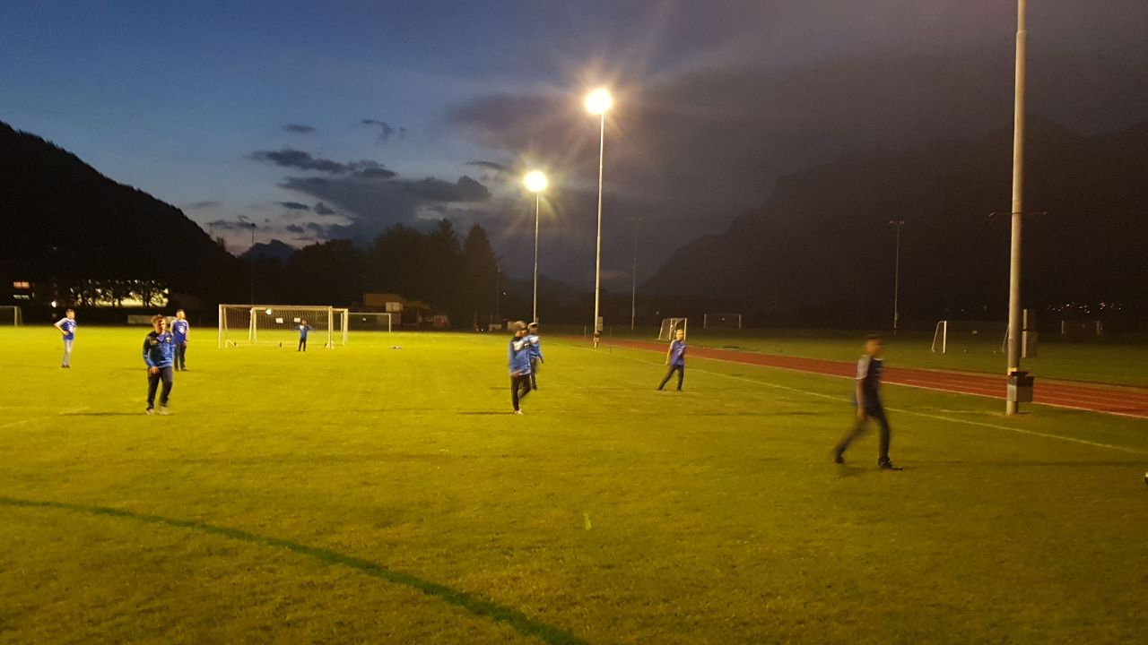In Landquart ging es dann erstmal zur Unterkunft. Wir übernachteten im wohl sichersten Ort des Kantons Graubünden. Wir bezogen unser Quartier in der Kaserne des Katastrophenschutzes. Nach dem Nachtessen im Clubhaus des FC Landquart-Herrschaft durften wir noch kurz unter Flutlicht trainieren.