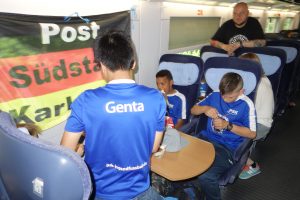 Unsere Jungs kämpften nicht nur mit den mitgebrachten Lebensmittelvorräten. Um sich auf ein anstrengendes Turnier vorzubereiten, bevorzugten die Jungs vor allem Lebensmittel mit hoher Energiedichte. Zwischendurch mussten sie dann Autogramm- und Selfie-Wünsche erfüllen. Eine Inderin bat unsere Jungs höflich um ein Mannschaftsfoto. Sie erzählte uns dann auch, dass unser Zug gar nicht nach Landquart fährt, sondern in Basel endet. Da hat sich der Englisch-Unterricht unserer Jungs schon in praktischem Nutzen ausgezahlt. Also nix mit entspannter ICE-Fahrt nach Landquart. Wir mussten in Basel SBB umsteigen. Während sich das Bahn-Personal verkrümelte, schickte uns Jan aus Landquart die Anschlussverbindung. Die Schweizer Bundesbahn hatte dann auch einen Ersatzzug vorrätig. Also ging es dann per IC weiter nach Landquart. Übrigens, falls ihr mal mit der Bahn in der Schweiz unterwegs seid: Das Öffnen der Fenster während der Fahrt ist verboten.