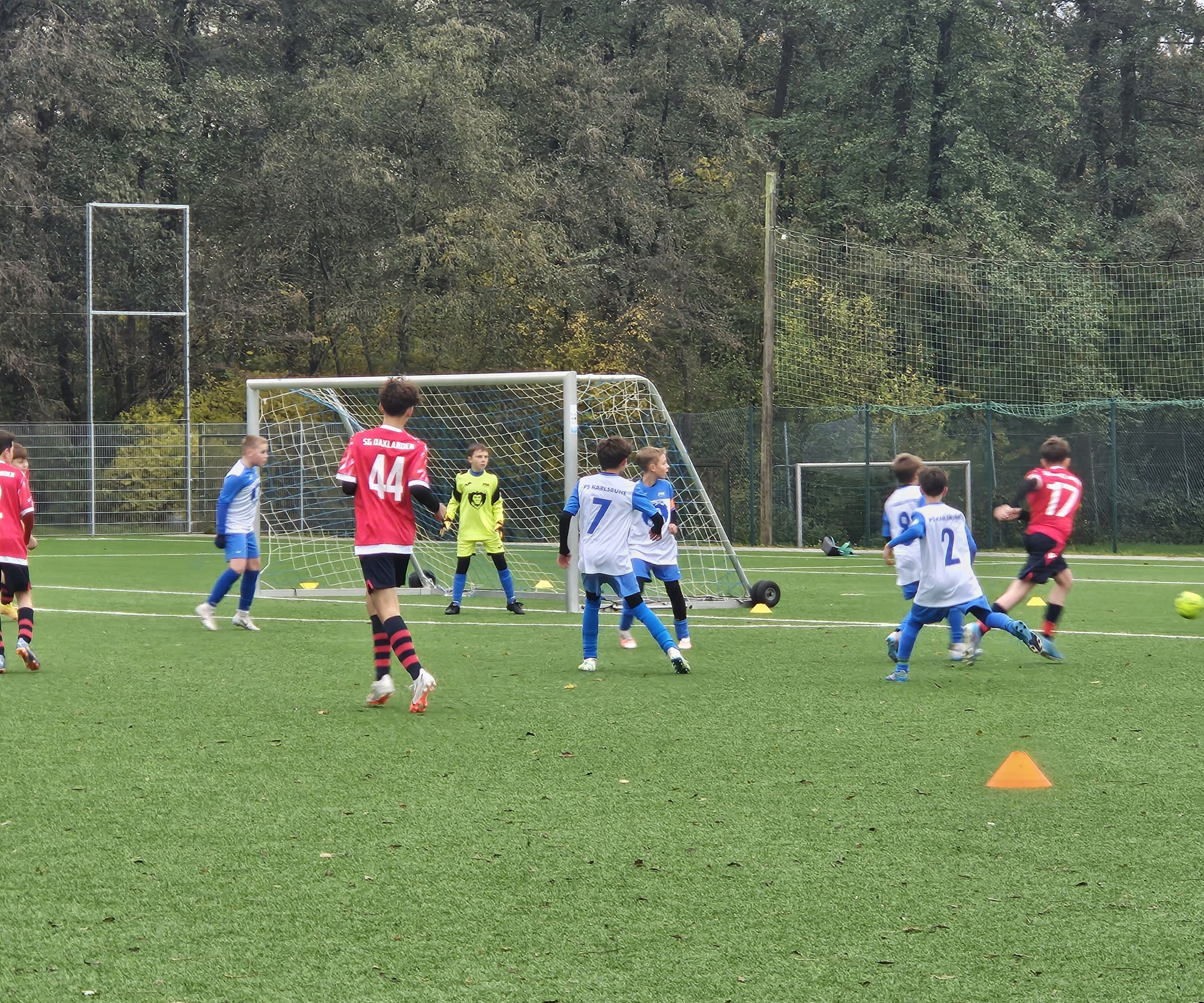 Die Gäste kamen mit Wucht ins Spiel. Innenverteidiger Till schüttelte es in den Zweikämpfen ordentlich durch. Spätestens nach vier Minuten wusste Till, dass es mit einer neuen Brieffreundschaft heute nicht klappen würde. In der fünften Minute dann die erste vielversprechende Offensiv-Aktion der Löwen. Der SG-Keeper unterband diesen Angriff. Allerdings regelwidrig innerhalb des Strafraums. Den fälligen Strafstoß konnte der SG-Keeper jedoch entschärfen. Da viel Körper und gar kein Ball im Spiel war, holte sich der SG-Keeper für die Aktion noch den gelben Karton. Spielstand weiterhin 0:0. Ab der 10. Minute hatten die Löwen das Spiel zunehmend unter ihrer Kontrolle. Manus Ball konnte der Gästekeeper noch entschärfen. Wenige Sekunden später stellte Finn auf 1:0 für den PSK. Jetzt spielte nur noch der PSK. Immer wieder kurbelte Felix das Löwenspiel auf der linken Seite an. In der 13. Minute zeigte der Gästekeeper eine Glanzparade. Wenige Sekunden später nagelte Patryk das Leder aus 20 Meter Entfernung trocken unter die Latte. 2:0. Nur fünf Minuten später schickte Patryk Manuel. Manu baute die Führung auf 3:0 aus. Eine Minute später machte es der Spieler des Spiels Patryk wieder selbst. 4:0 PSK nach 19 Minuten. Patryk nicht „nur“ Doppeltorschütze, sondern auch Kreativabteilung des Löwenspiels.