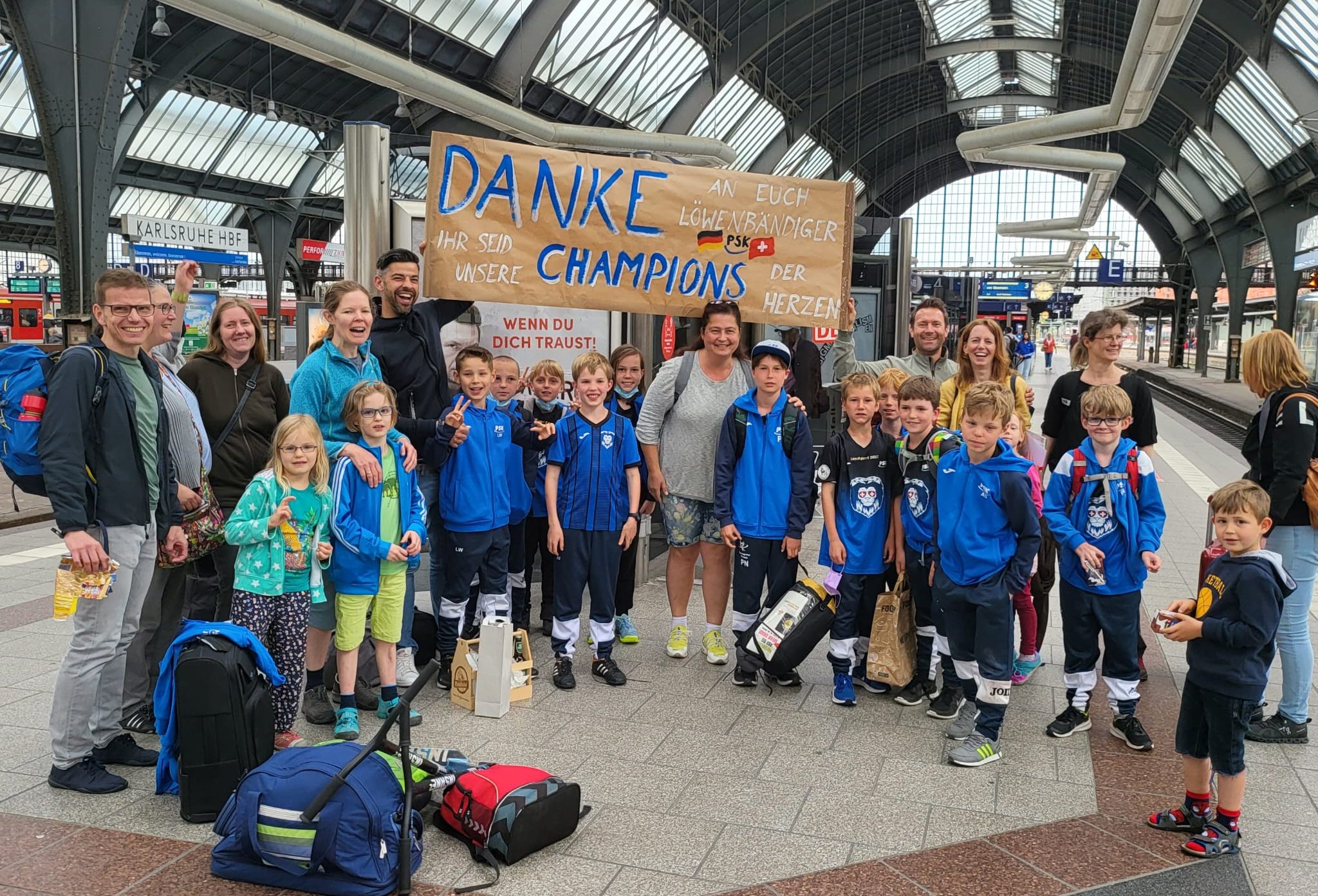 Als kurz nach Basel das Zugpersonal auf die in Deutschland geltende Maskenpflicht verwies, wussten wir, wir sind wieder zurück im Alltag. Aber eine Überraschung wartete noch auf unser Team. Denn kurz nach 15:00 Uhr rollten die Löwen unter dem ohrenbetäubenden Lärm ihrer größten Fans wieder in der Fächerstadt ein. Danke @Eltern für eure Unterstützung und den rauschenden Empfang.