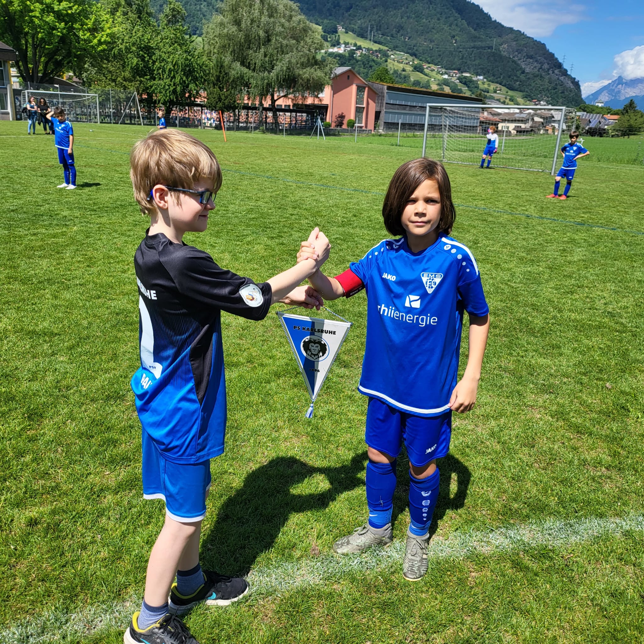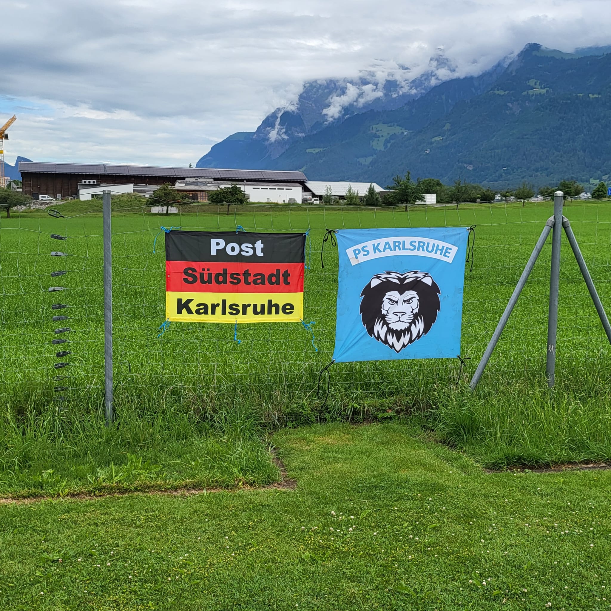 Um 10:56 Uhr war es endlich so weit. Das Warten hatte ein Ende. Das A-Team des gastgebenden FC Landquart erwartete uns zum Eröffnungsspiel. Für die ???? war es wie früher in der E-Jugend. Denn in Graubünden spielt die E-Jugend 6+1 mit Einwurf und indirekten Freistößen.  Also wie bis zur letzten Saison auch in Deutschland. El Capitano Paul überreichte vor jedem Spiel seinem gegnerischen Pendant einen PSK-Wimpel.