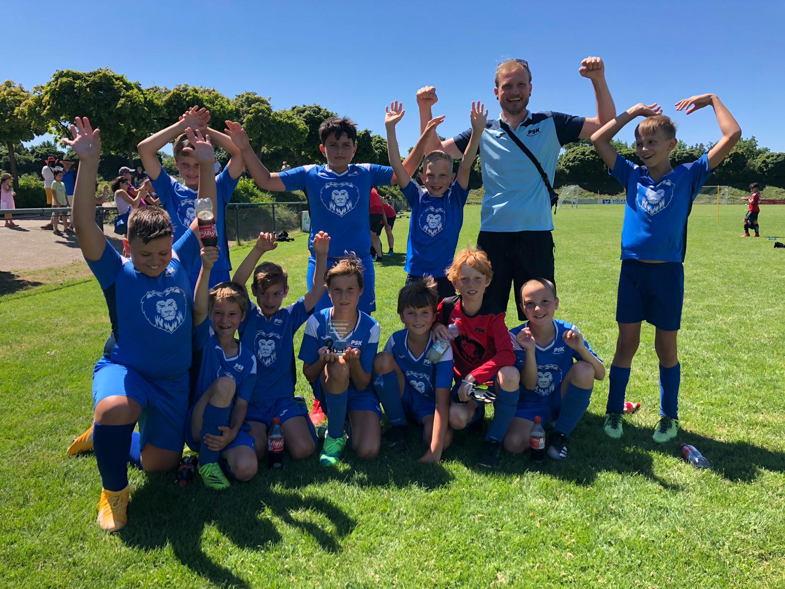 Im letzten Vorrundenspiel ging es gegen den Turnierfavoriten. Zumindest, wenn man den Beiertheimer Wettbüros Glauben schenkte. Doch es kam anders. Anpfiff – Bares auf Fritz – Fritz von der Mittellinie an den Querbalken. Noch (!) kein Tor. Aber denn stoppte Elias einen Kickers-Angriff in der eigenen Hälfte. Er übergab die Kugel an Fritz . Fritz machte Meter und servierte Bares den Ball. 1:0 PSK durch Bares. Ekstase im Gästeblock. Dabei stand das Beste noch bevor. Patrik erhöhte auf 2:0, Bares auf 3:0, Elias stellte auf 4:0 und Fritz markierte den Endstand 5:0. Gewonnen wurde dieses Spiel jedoch in der löwenstarken Abwehr. Felix und Patryk unterbanden jeden Angriff erfolgreich. Ok fast jeden. Einmal kam die Kugel auf unser Tor. Leon machte sich ganz lang und pflückte die Kugel aus der Ecke.